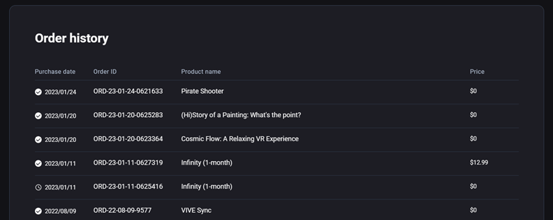 Your VIVEPORT Infinity order history will be displayed, with the most recent order appearing first. Click an order to view details about it.
