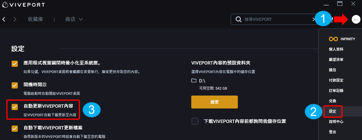 - 點選右上角頭像 > 「設定」,將「自動更新 VIVEPORT 內容」選項打勾後系統便會自動更新。